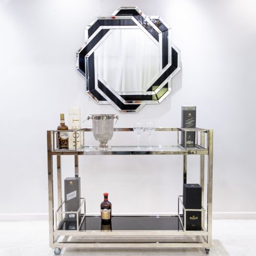 Carrobar redondo importado fabricado en madera de roble termoformada y estructura de acero pintado al horno color dorado. Contiene ruedas y manija de madera para su desplazamiento.