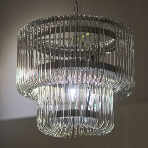 Araña importada con estructura en acero cromado pulido brillante. Caireles de cristal tallados.