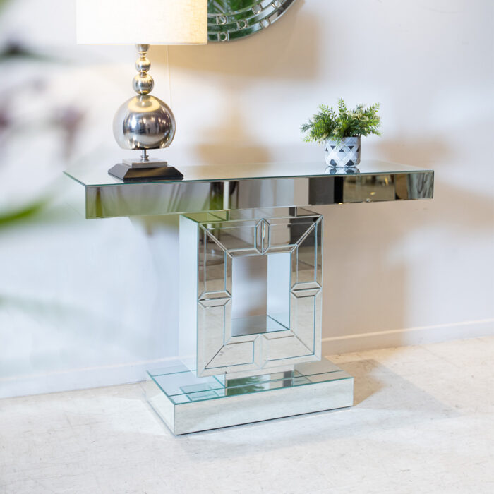 Consola importada revestida totalmente en espejo biselado. Medidas: 1.20 x 36 x 80 cm alto
