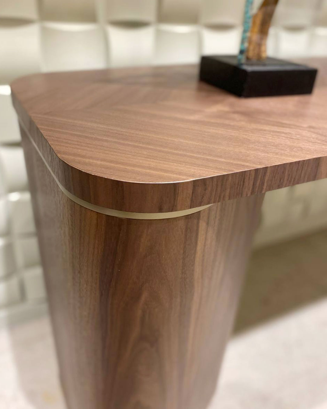 Recibidor importado fabricado en madera de nogal termoformado con detalles en color champagne. Tapa en madera de nogal con diseño arresca.