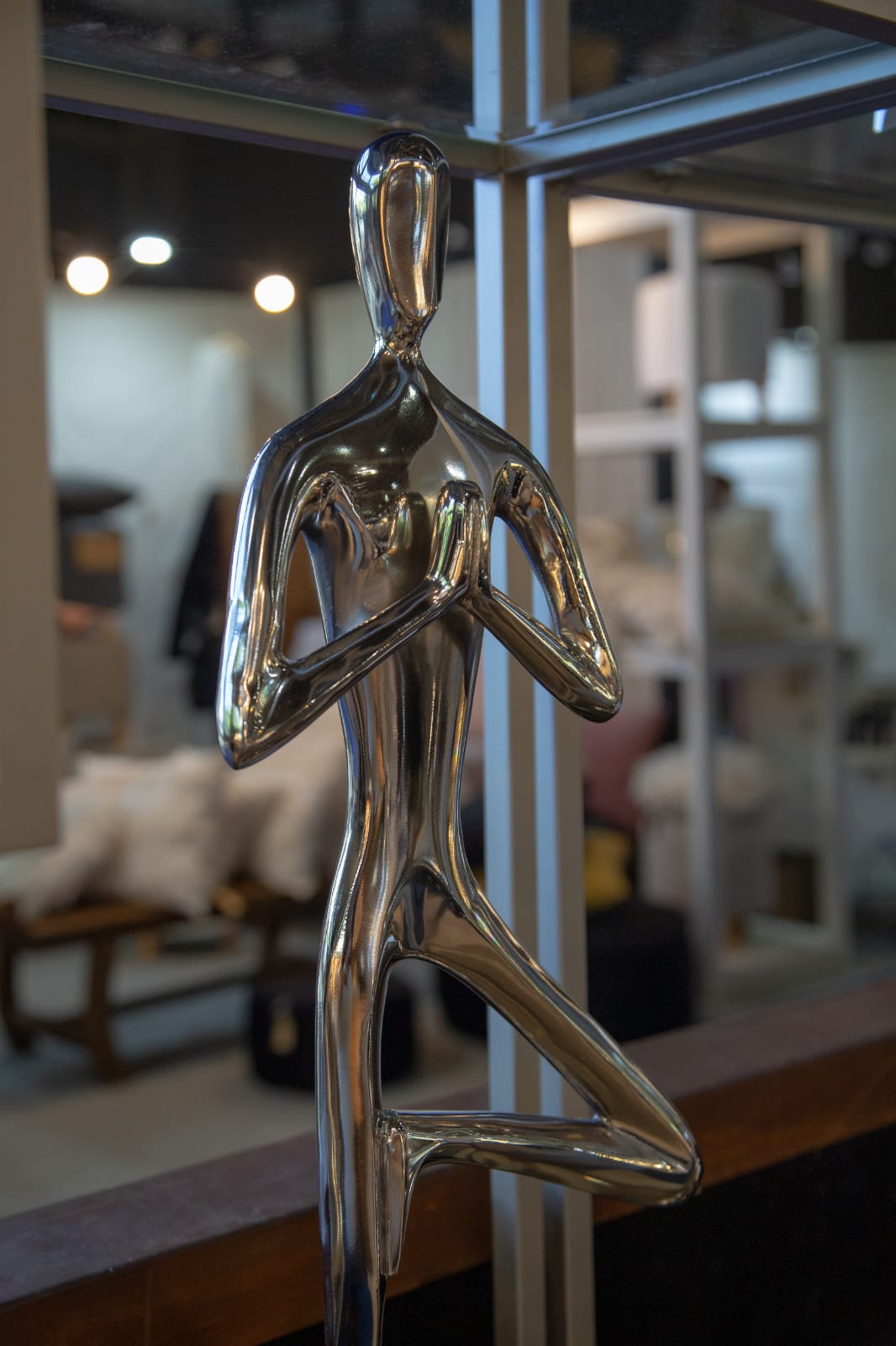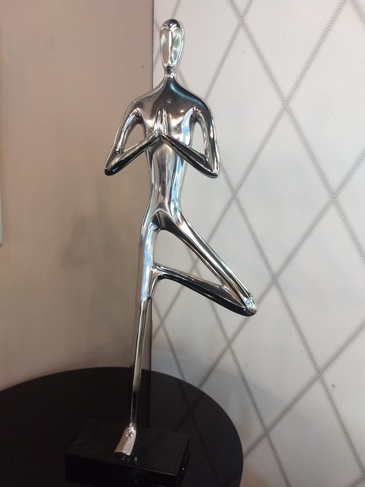 Escultura importada fabricada en aluminio niquelado. Medidas: 20 x 10.5 x 78.5