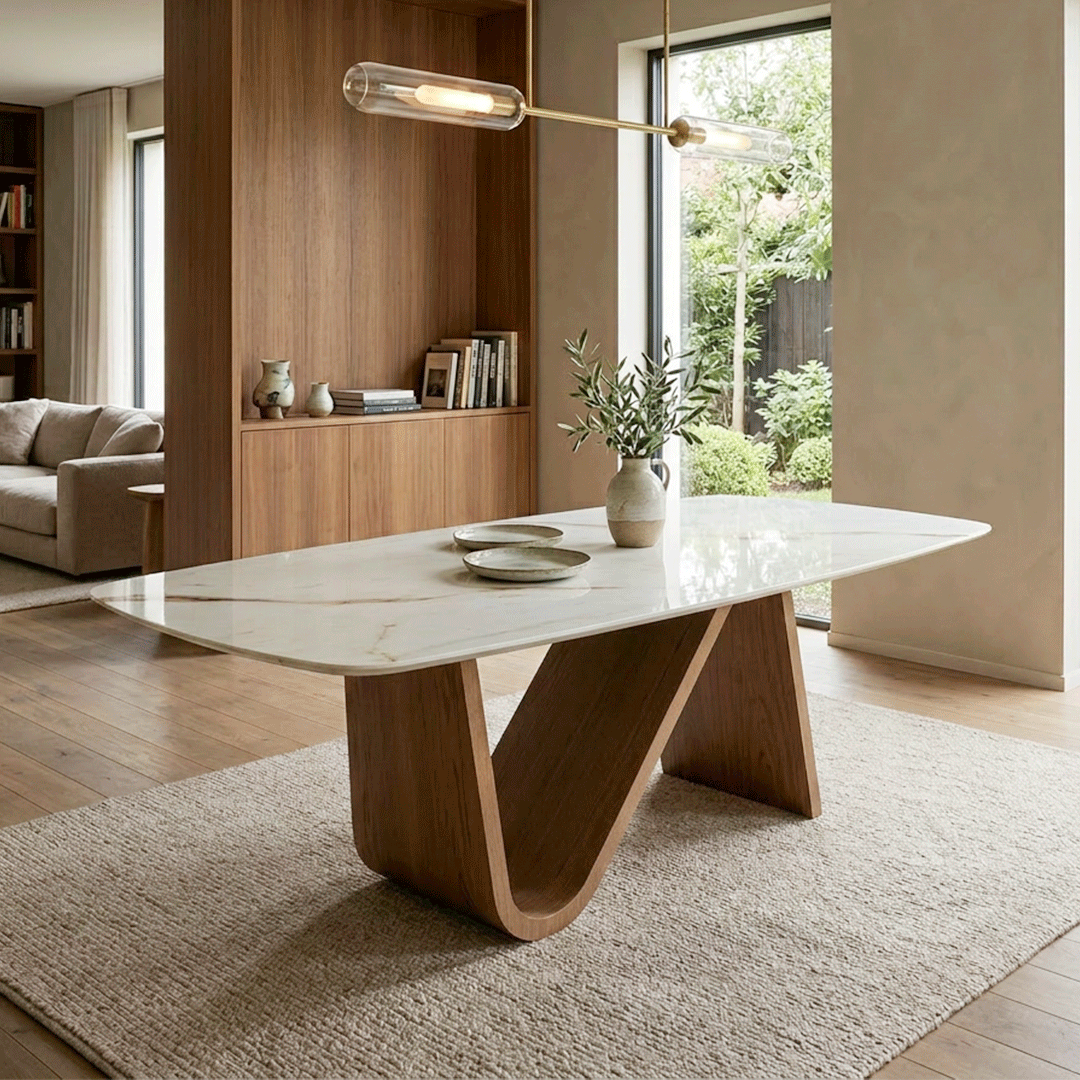 Mesa de comedor importada con base de madera de roble termoformada y tapa de madera laqueada blanca con vidrio serigrafiado simil marmol.