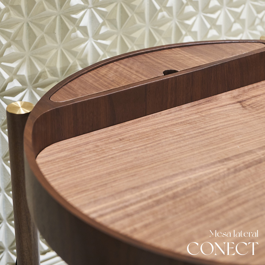 Mesa lateral importada fabricada en madera de nogal. Contiene puerto usb para cargar el celular en un compartimiento escondido con tapa. Por lo que esta mesa va enchufada a un tomacorriente. Tapa de vidrio inferior.