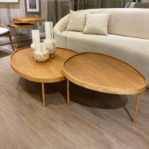 Mesa de comedor importada fabricada en madera de roble. Base varillada de madera con estructura de acero pintada al horno color off white. Tapa con corte saarinen.
