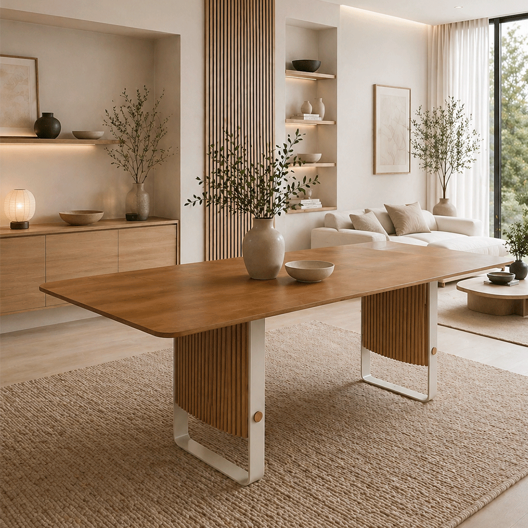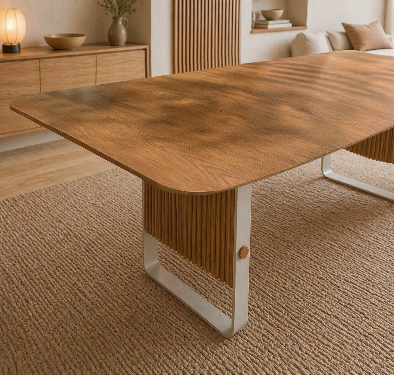 Mesa de comedor importada fabricada en madera de roble. Base varillada de madera con estructura de acero pintada al horno color off white. Tapa con corte saarinen.