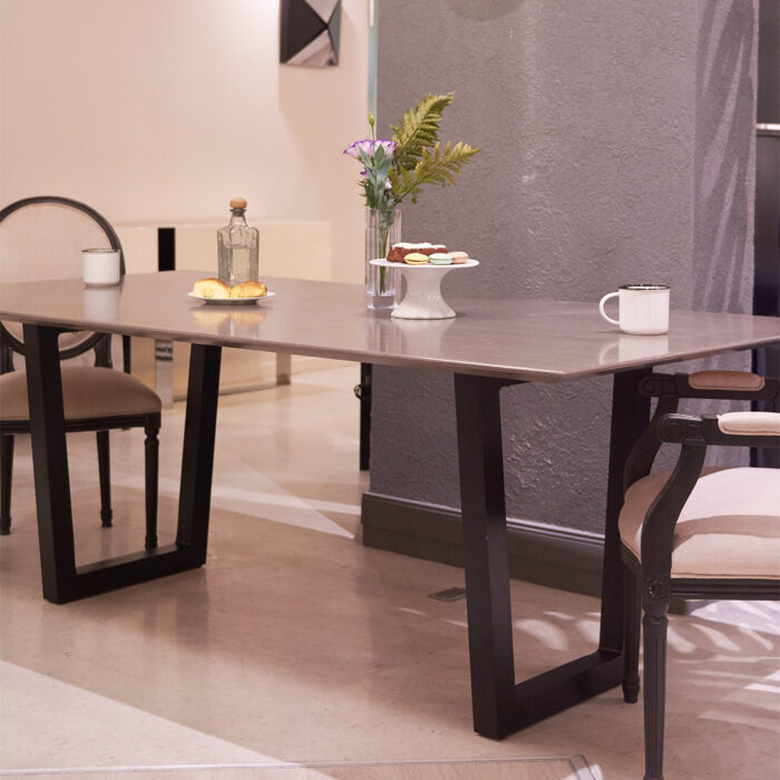 Mesa de fabricación nuestra con bases en madera laqueada negra y tapa enchapada en lamina de madera roble gris. Medidas 2.20 x 1.10
