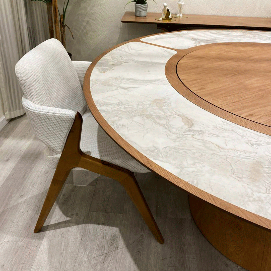 Mesa redonda importada fabricada en roble con disco giratorio central. Tapa en combinacion de roble y simil marmol calacatta Gold.