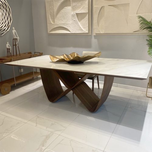 Mesa importada redonda con disco giratorio central. Tapa en vidrio serigrafiado color vison. Base enchapada en madera de cedro.