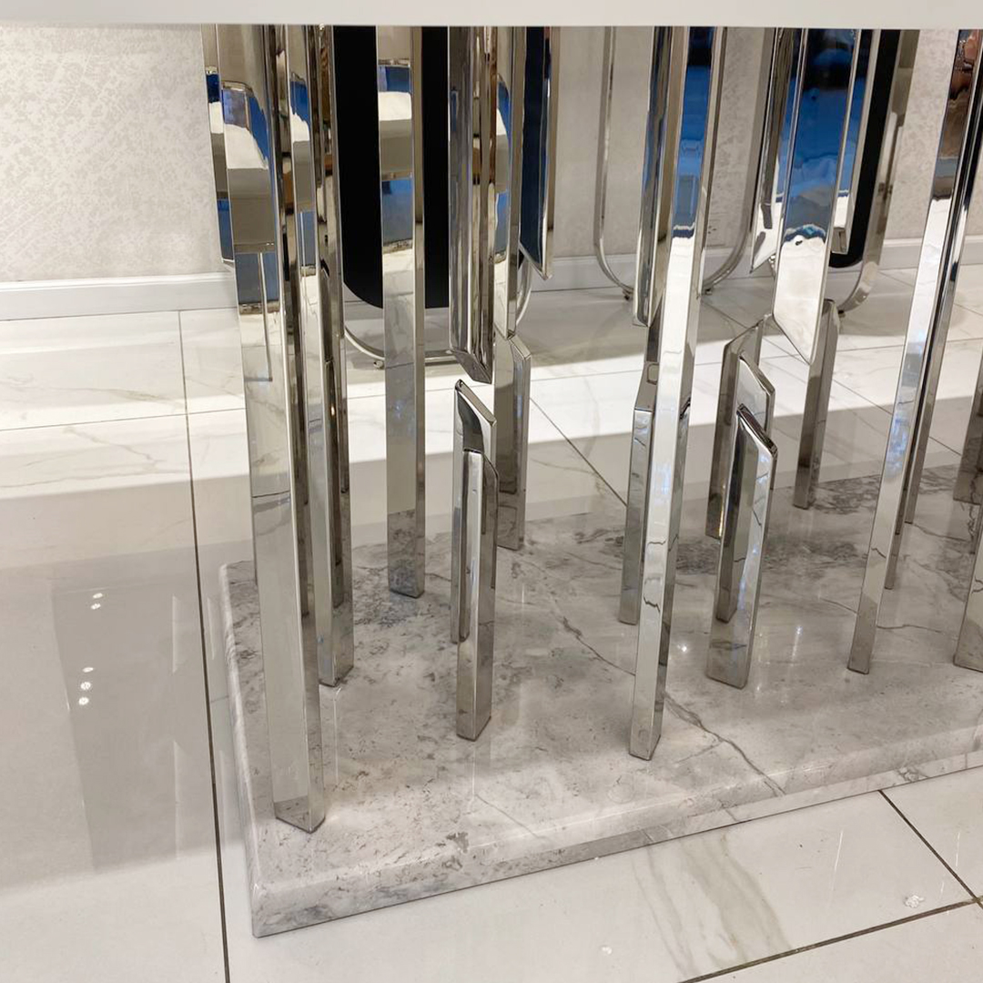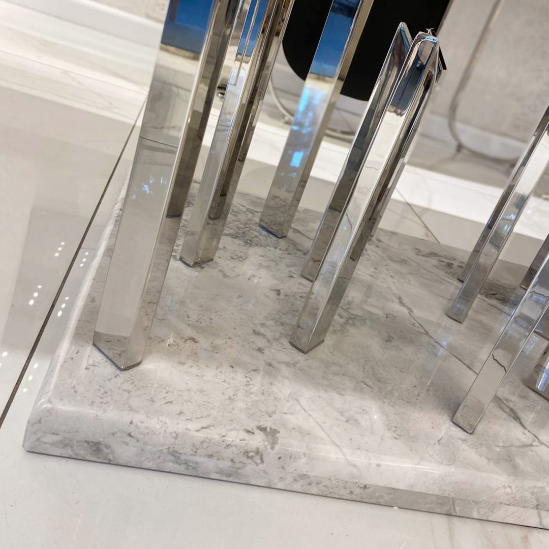 Mesa de comedor importada con base de marmol carrara. Estructura de acero cromado brillante, y tapa en madera laqueada blanca con vidrio serigrafiado blanco sobrepuesto.