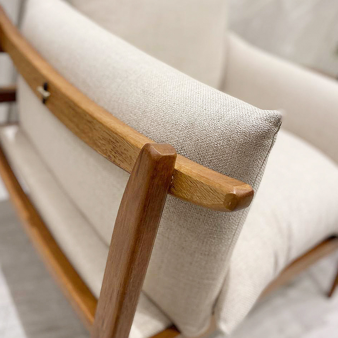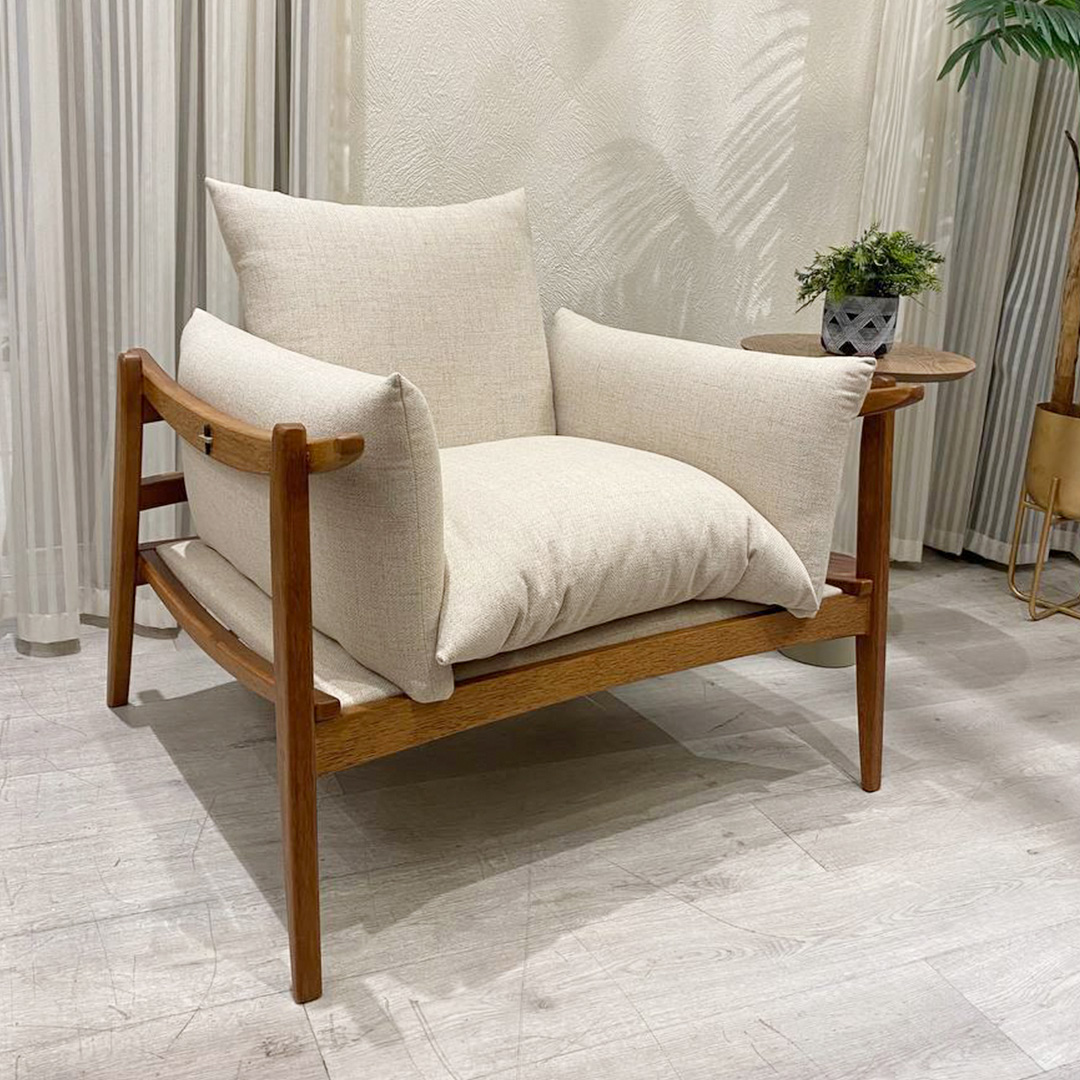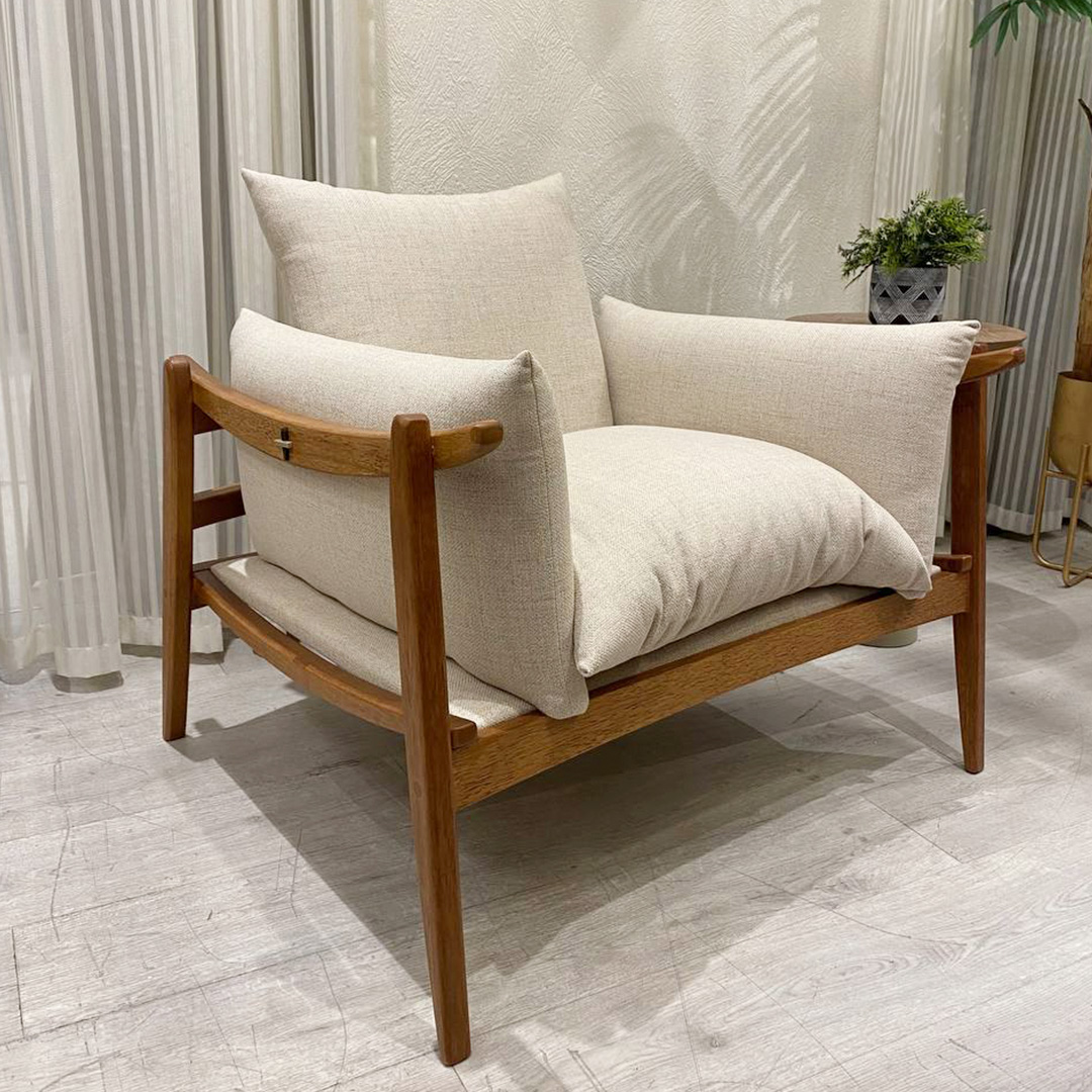 Sillon fabricado en madera con tapizado en tela de lino color beige con proceso antimanchas.