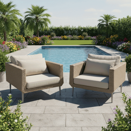 Sofá importado para exterior estructura en aluminio con pintura anticorrosiva. Tejido en cuerda náutica color Fendi y tapizado en tela impermeable desfundable color tostado. Medidas: 2.20 x 0.84 x 0.78mts